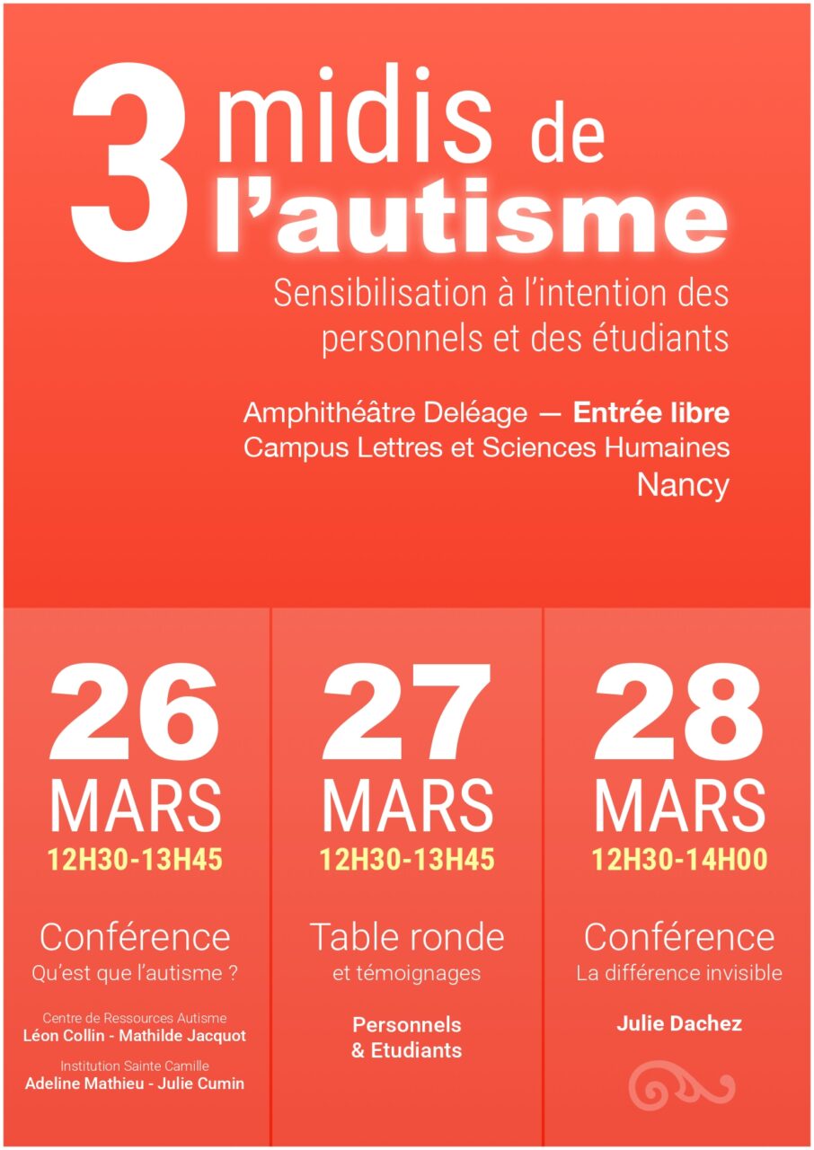 • Mardi 26 mars, de 12h30 à 13h45. Conférence de sensibilisation : Qu’est-ce que l’autisme ? Parcours diagnostics et d’accompagnement. Quelles implications à l’université ?