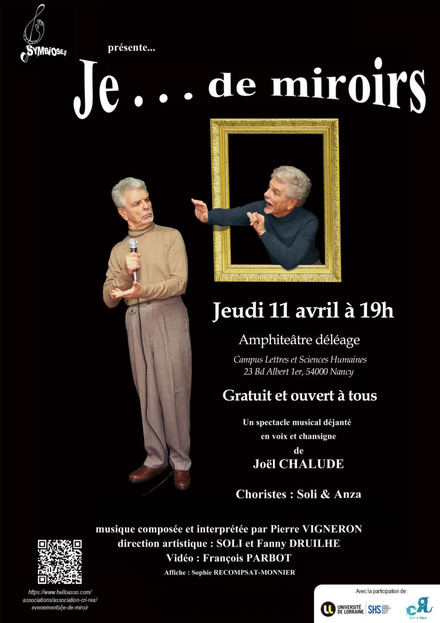 Venez découvrir « Je… de miroirs » , suite de textes personnels et d’autres empruntés à l’immense Jacques Brel, ce spectacle qui mêle mime, danse, chansons, chansignes et stand up, nous relate, dans une subtile palette de rires et d’émotions, les contradictions d’artiste, de militant et d’homme qu’est Joël Chalude, né sourd… au sein d’une famille de musiciens. D’ailleurs, Joël l’assume : il ne chante pas toujours juste, mais il joue toujours vrai.